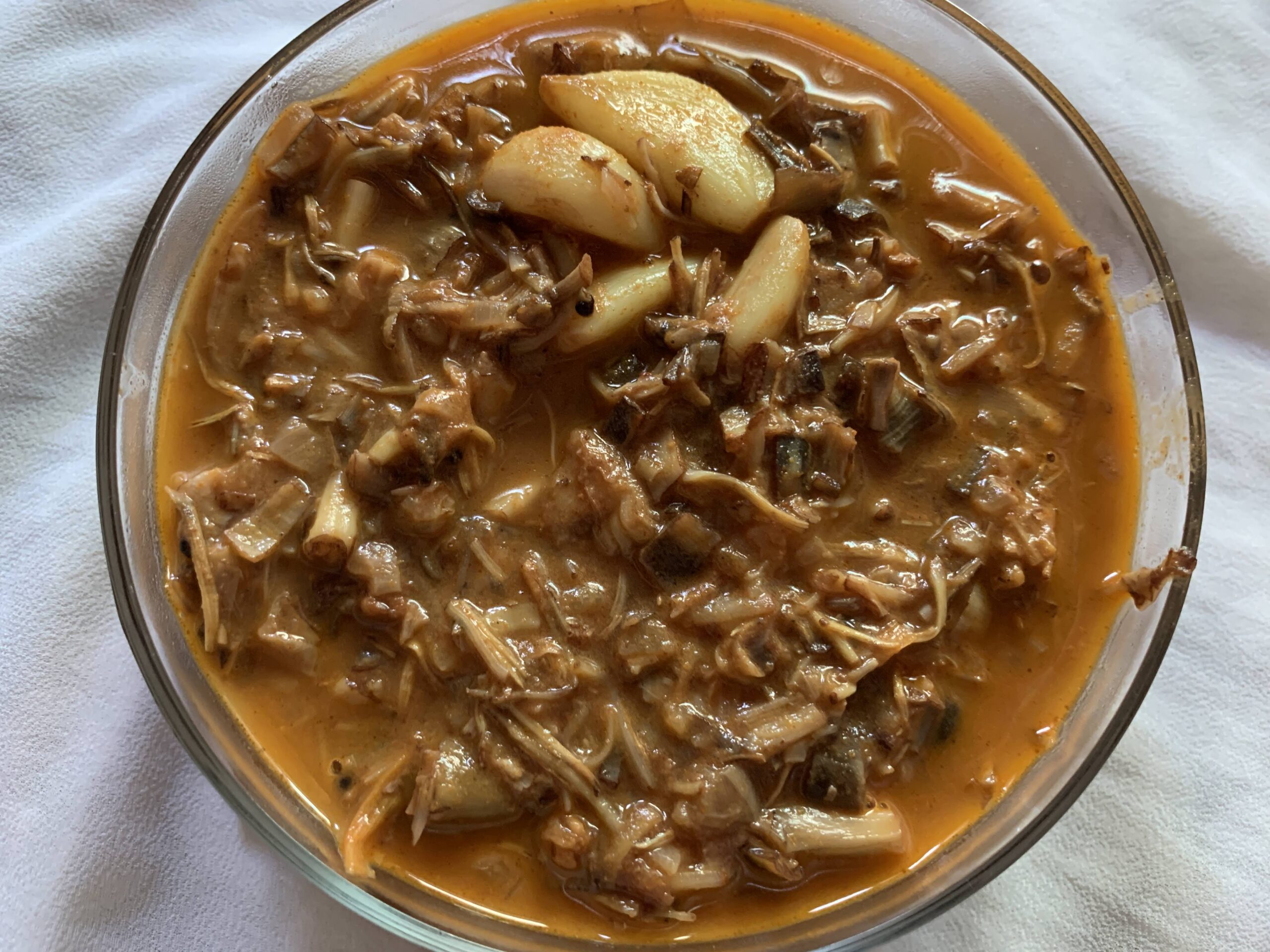 - In a pan add oil, when heated up splutter mustard, fenugreek and curry leaves. Add sliced small onion, garlic and saute for 2-3 min.