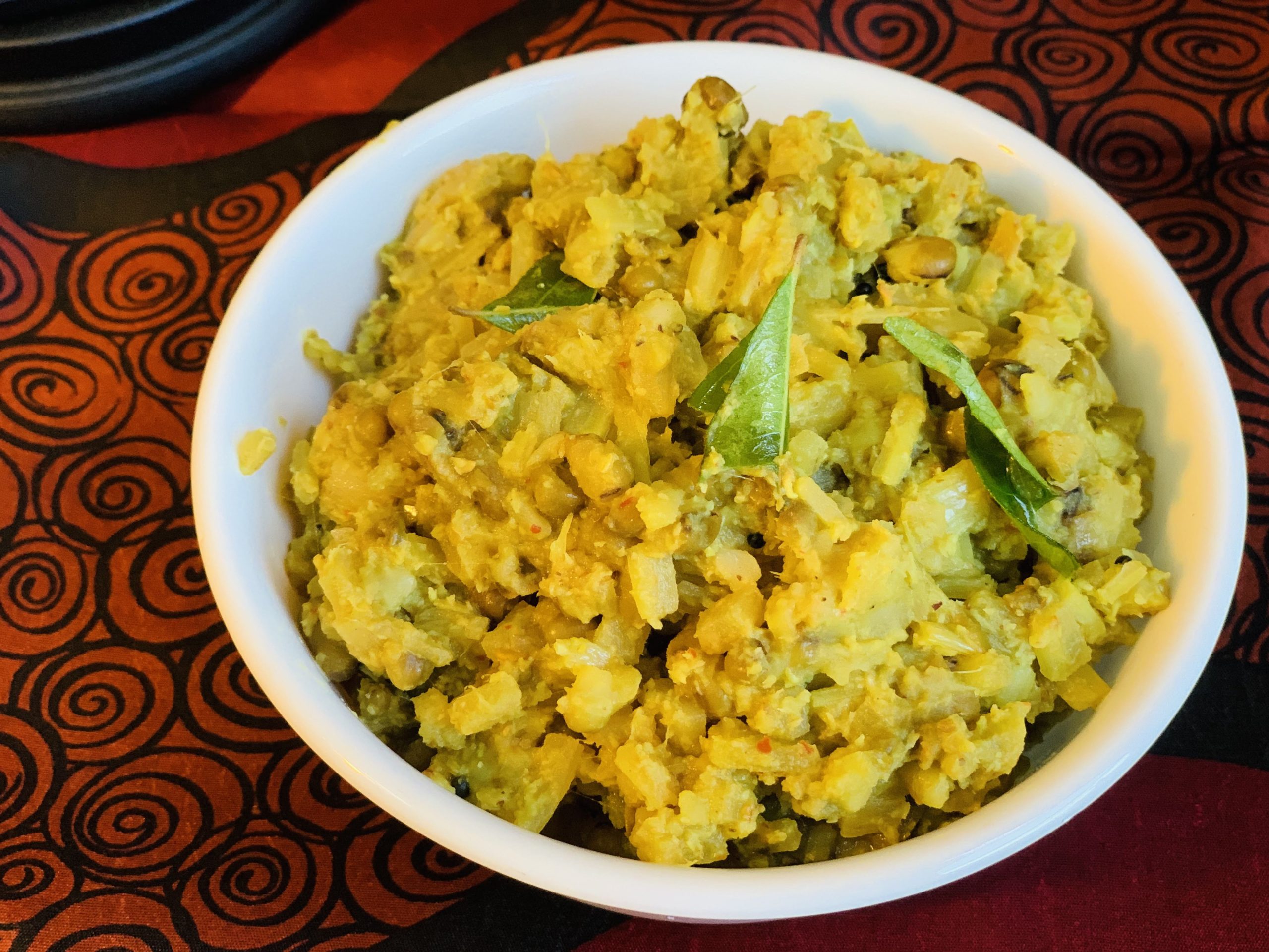 - Add banana stem, grinded coconut mix, salt and turmeric powder to green gram and cook for a whistle. (No need to add water if there is remains after cooking green gram, else add quarter cup water)