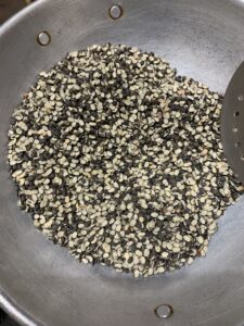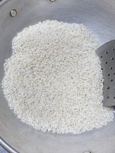 - Similarly dry roast raw rice till it becomes crispy enough to bite. This will take about 10-15 min in low flame.